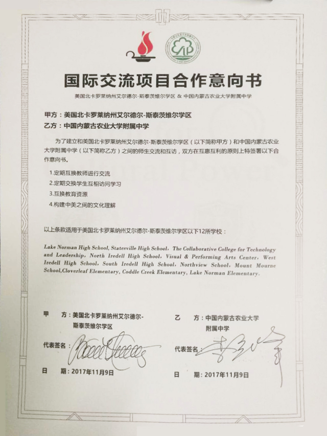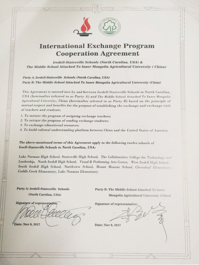 ▲与美国北卡罗莱纳州艾尔德尔?斯泰茨维尔学区签订合作意向书