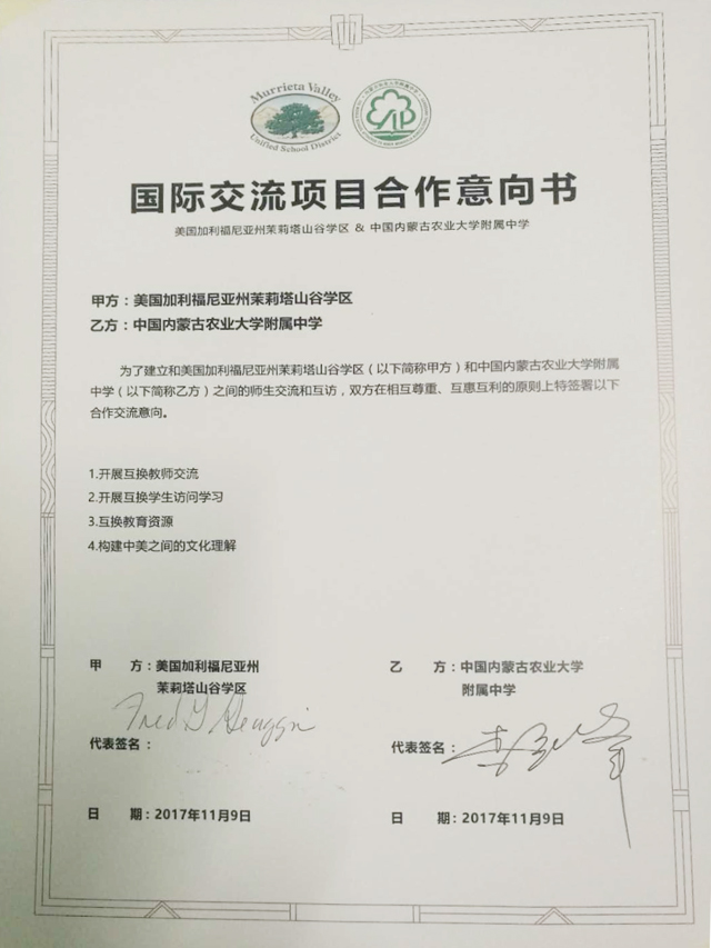 ▲与美国加利福尼亚州茉莉塔山谷学区签订合作意向书