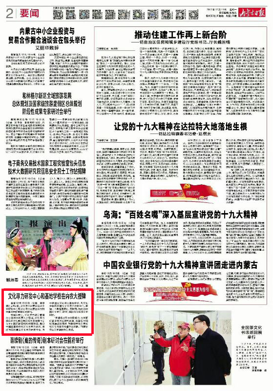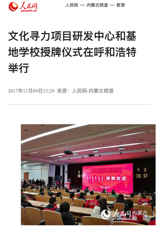 12月9日上午,在内蒙古农业大学博学楼报告厅举行了文化寻力项目内蒙古农业大学研发中心和内蒙古农大附中基地学校授牌仪式。文化部民族民间文艺发展中心主任李松,文化寻力项目管理办公室主任、TBI国际教育集团副总裁王学文,内蒙古农业大学副校长芒来、宣传部长王忠东,呼和浩特市教育局副局长余泽强、民族教育科科长浩日洼,赛罕区教育局副局长张志强,包头市青少年发展中心主任张雪峰等领导出席授牌仪式。呼和浩特市十余所中学校长和365bet手机客户端400余名学生及家长参加了授牌仪式,人民网、内蒙古日报、内蒙古电视台、内蒙古日报-旅游报、正北方网等媒体对活动进行了宣传报道。