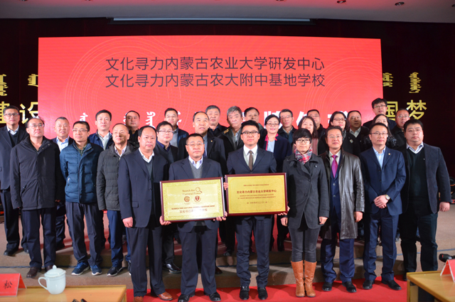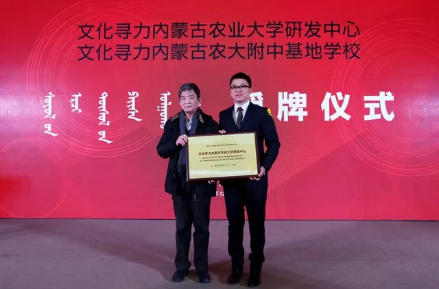 ▲文化寻力内蒙古农业大学研发中心授牌(国家文化部民族民间文艺发展中心主任李松;蒙古族工艺美术研究所所长毕力格巴图)