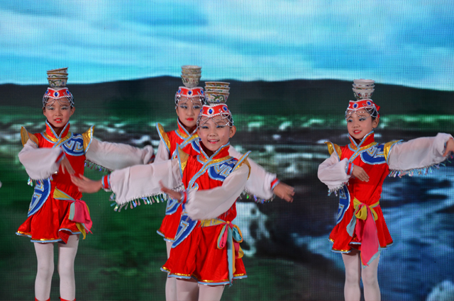 ▲授牌仪式上,我校学生表演了蒙古族顶碗舞、葫芦丝齐奏、古筝合奏等校园传统文化特色节目。