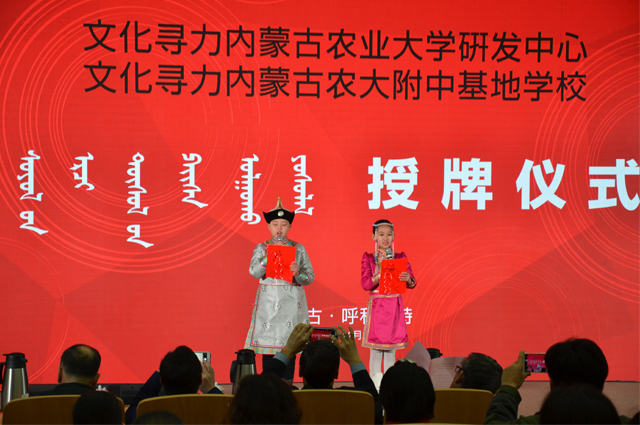 授牌仪式现场播放了“文化寻力项目介绍宣传片”、“蒙古族工艺美术研究所宣传片”和“365bet手机客户端宣传片”。李松主任和王学文副总裁分别为文化寻力内蒙古农业大学研发中心和文化寻力内蒙古农大附中基地学校授牌,标志着内蒙古自治区第一所文化寻力研发中心和基地学校正式挂牌成立。