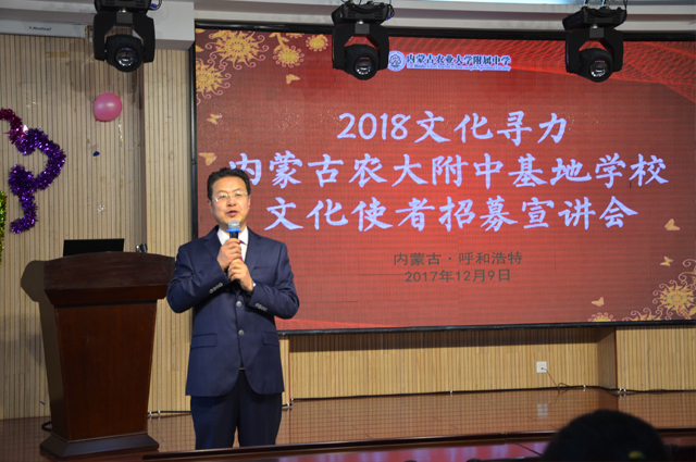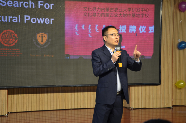内蒙古农业大学副校长芒来教授在致辞中表示:内蒙古农业大学作为国家首批32个大学生文化素质教育基地,一贯重视发挥大学文化传承创新的功能,多年来在传承弘扬中华优秀传统文化、革命文化和社会主义先进文化的过程中,培育了肥沃的文化土壤和深厚的文化积淀,形成了“塔林夫(草原之子)”和“蒙古马”等丰富文化内涵的校园精神,涌现出了集中体现“舍己救人、不怕牺牲”精神的郝龙彪英雄集体;集中体现“自强不息、感恩社会”精神的李莹、集中体现“手足情深、不离不弃”精神的背学兄弟庄宏泉、庄汇泉;集中体现“孝老爱亲、乐观积极”精神的杜威等一批中国特色社会主义文化的优秀践行者。内蒙古农业大学成为文化寻力研发中心正是中华传统优秀文化重要组成部分—蒙元文化研究成果走出国门、走向世界的一座桥梁。希望通过双方共同努力,收获更好更多的文化研究成果,为推进国际传播能力、讲好中国故事提供智力支持,形成新时代高校发挥文化传承创新功能的典范,在服务内蒙古农业大学“文明校园”建设的同时,为推进中华优秀传统文化传承和传播做出贡献。农大附中要以成为文化寻力项目基地学校为契机,与家庭和社会共同努力,为孩子们获得更多的自信、拥有长远的眼光、在全球化的竞争中找到自己的位置、拥有更加广阔的未来贡献力量!