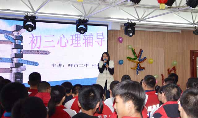 为提高我校九年级学生的心理素质,缓解校一模的考前压力。11月27日,学生处专门邀请了国家二级心理咨询师、呼市教研室心理教研员、呼市二中心理健康教师——程姣老师,在我校励志楼为九年级学生带来了一场心理健康教育讲座。